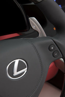 Helping to provide balance and scale to the design, which features an overall length of 175.6 inches and a wheelbase of 102.6 inches, are high-performance tires on turbine-styled alloy wheels. The front tires are 265/35R20s, while the rears are 305/30R20s. Like the LF-A coupe, the brakes consist of 14.2-inch cross-drilled, vented discs up front, and 13.6-inch cross-drilled, vented discs at the rear. The front brake calipers are six-piston units and the rear calipers use four pistons each.